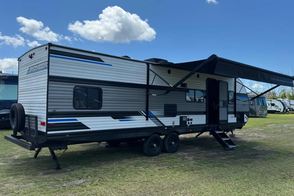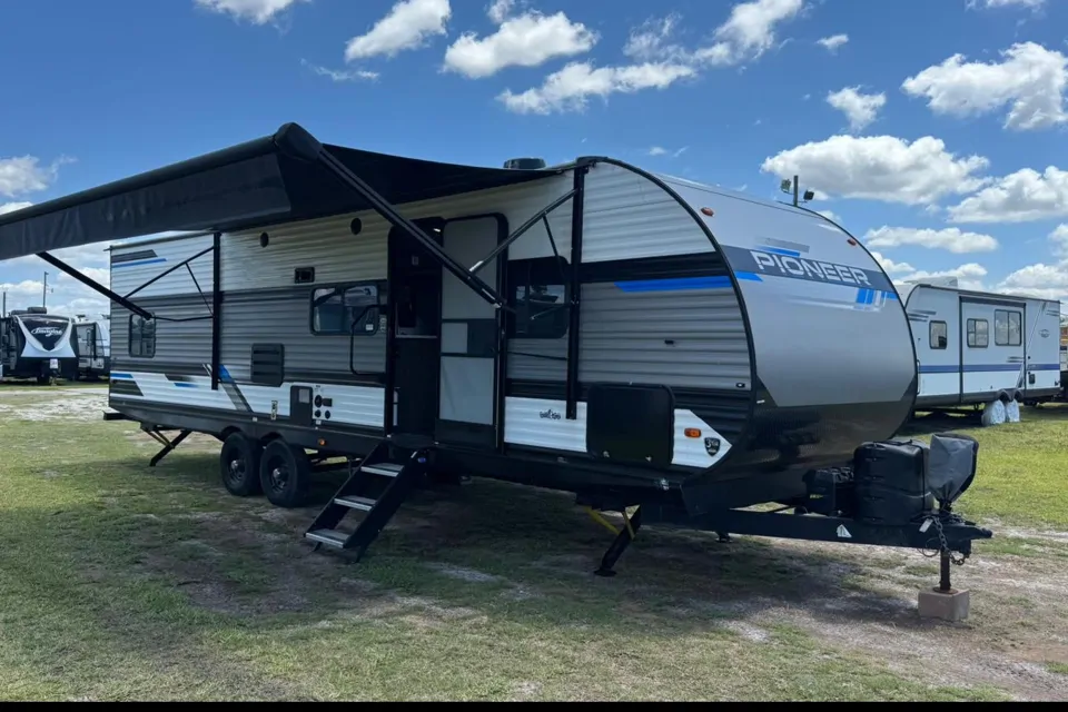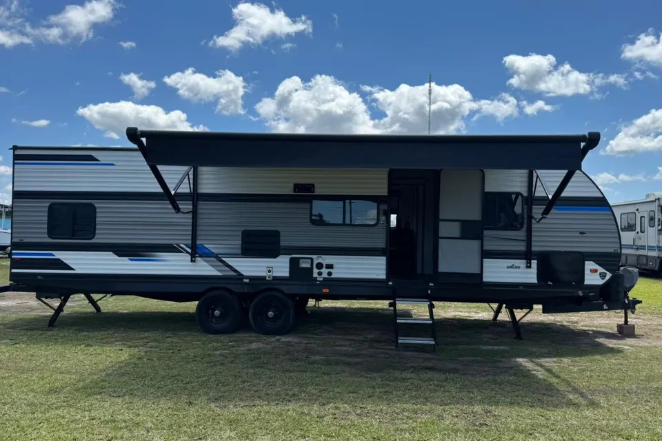 Travel trailer with one queen size bed. The table and sofa can become into beds. A separate room with bunk beds. Bathroom includes detachable shower head. Has one slide out. Great trailer to take and lots of space.