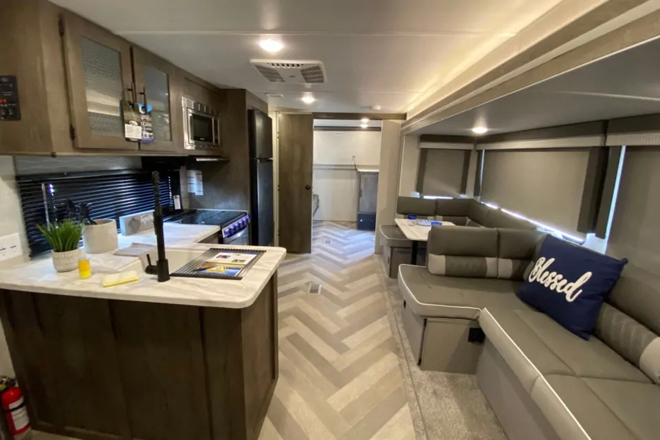 Enjoy traveling in this lovely 2 bedroom spacious, comfortable, and clean travel trailer. Equipped with all the EXTRAS: including an outdoor rug, camp chairs, tables, & a 3 inch cooling MEMORY FOAM mattress topper. This travel trailer comes equipped with all the bells and whistles A nice full-size bathroom with large shower. The bath is clean and spacious. We provide you with towels and wash clothes if requested. Included is RV safe toilet paper, a floor mat, shampoo/cond. and soap.