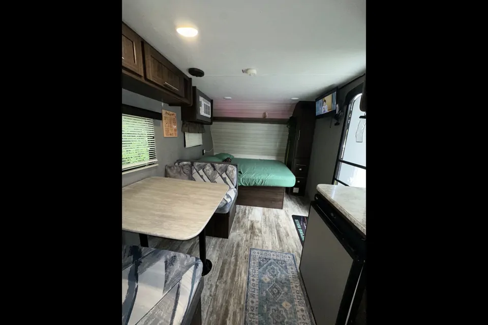 Sleeping arrangements for up to 5: a cozy queen bed, a convertible dinette that sleeps 1, and bunk beds suitable for a teen and two children—or one adult and a teen.