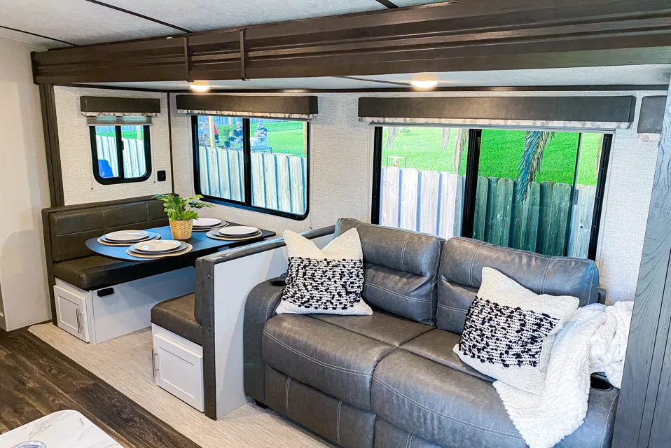 In the large slide out, you will find a modern tri-fold sofa and a dinette which also converts to sleep 2 small adults or children. On the other side of the slide out, you will find one of our favorite places in the trailer, the kitchen, which is equipped with everything you need to cook up some delicious meals for your family while enjoying the beauty of outdoor living.