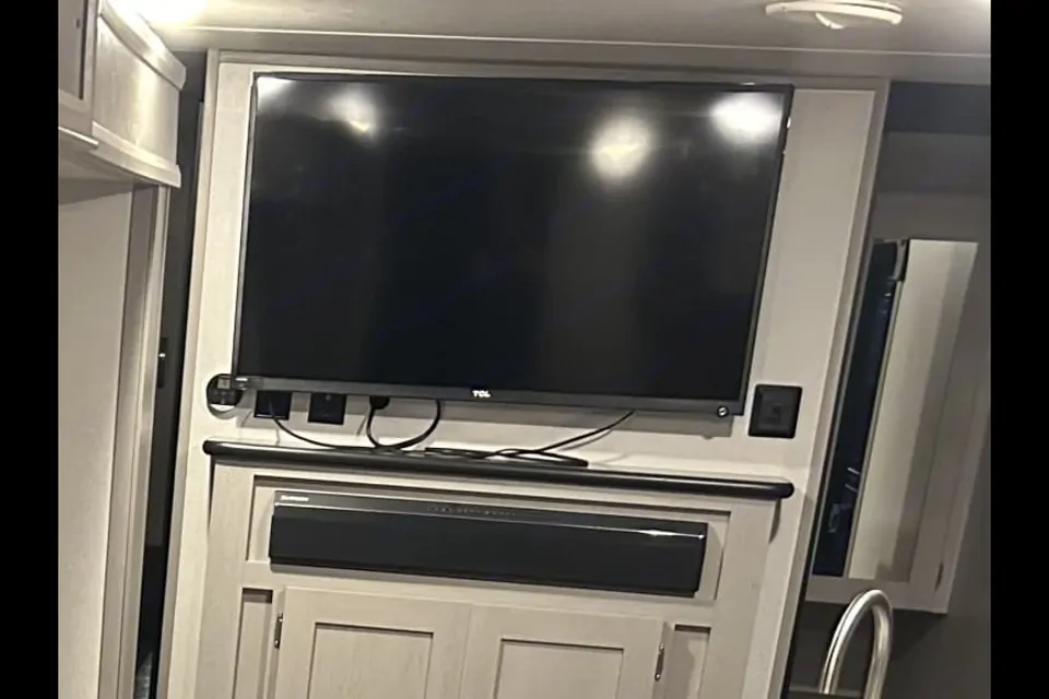 Enjoy this home away from home. Play your relaxing music with Bluetooth speakers inside and outside as you sip your morning coffee under the camper length awning or sit inside and watch the 42” tv in mounted on the wall. With a private bedroom, this is the perfect seclusion from the rest of your guests. Satellite/cable hookup access is available (depending on the campground).