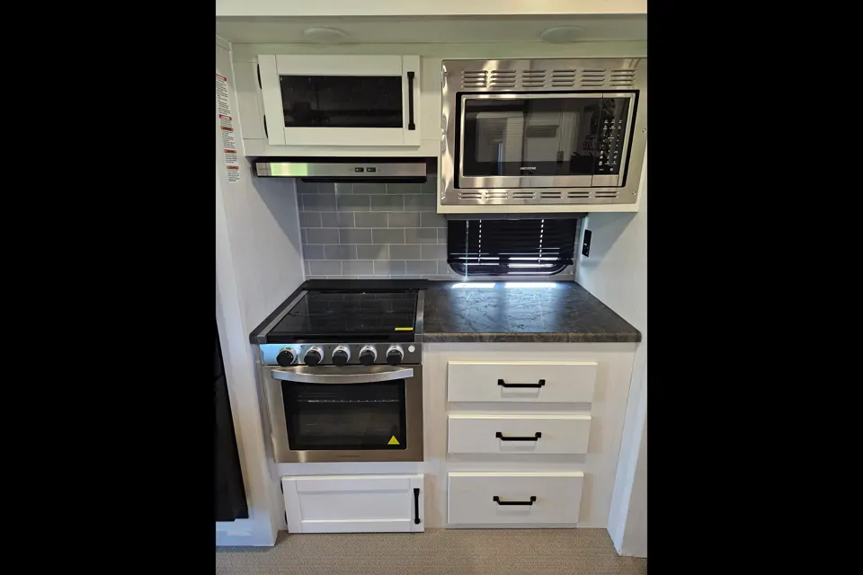 Well-Equipped Kitchen: Includes a gas-burning stove, fridge, microwave, and generous counter space.