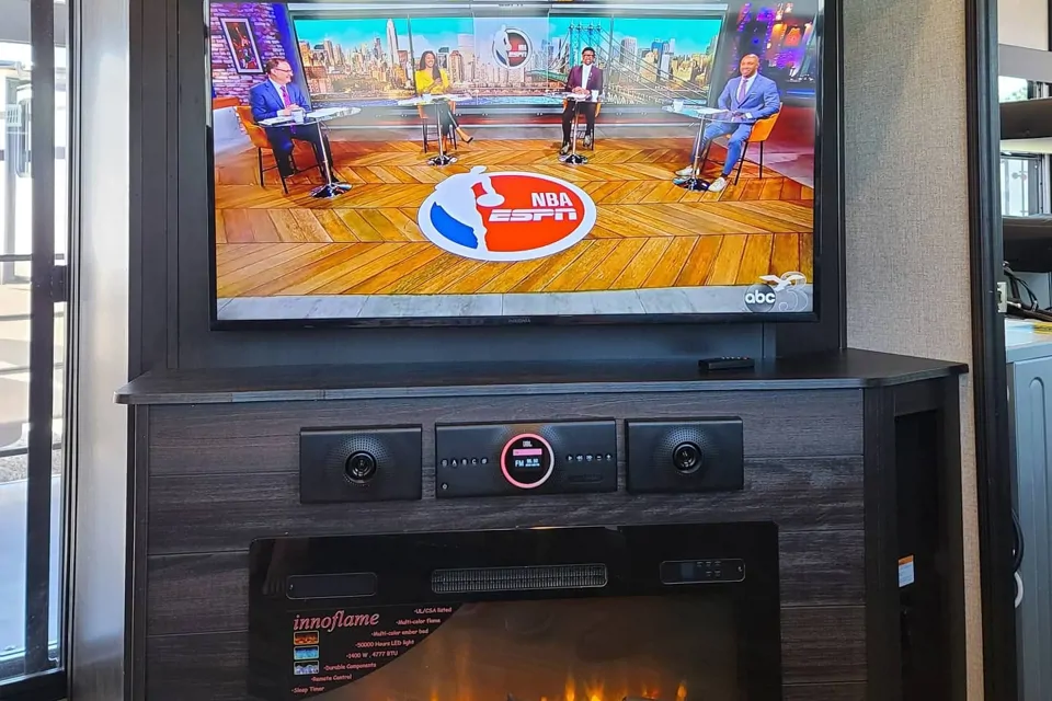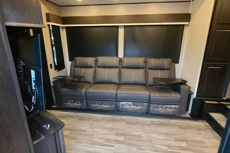 A beautiful and spacious 5th wheel with room for everyone. The master bedroom is a king bed with bunk beds in the back. There is also a half bath in the back for the kids. There is a super large couch to relax on, with a loft bed in the middle of the camper. Bask and side patio to relax on, both with an awning.