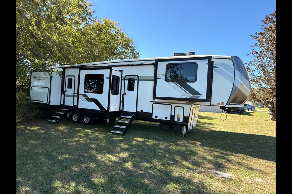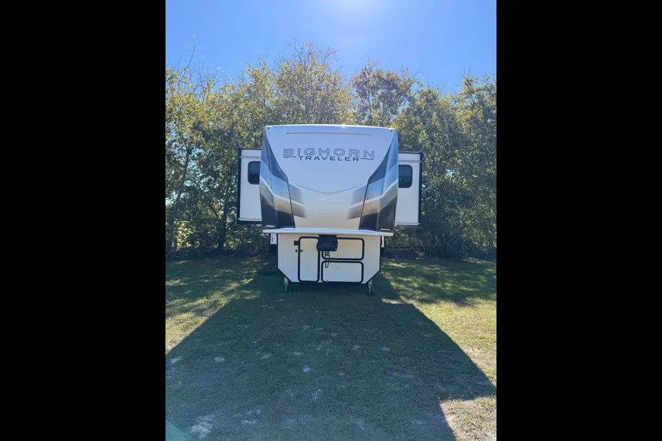 This is a brand new fifth wheel never been used. It is a front living model with large TV in the living room and a fireplace. Big kitchen with microwave, stove, oven residential fridge and large cooking area. Bathroom with shower, toilet and sink and in the back you have the master bedroom with king size bed and lots of storage for your belongings.