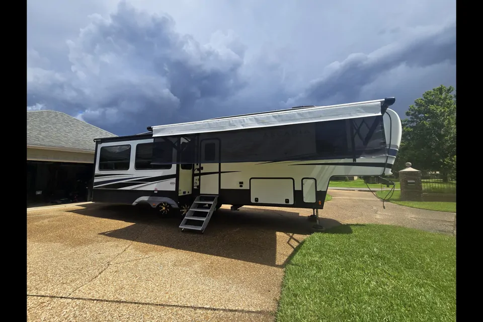 2022 Keystone Arcadia 3660RL with beautiful layout. Fifth wheel, tracks beautifully, in-bed hitch available with adapter for puck system in Ram 2500 (adaptable to other truck beds), new Goodyear Endurance tires, 3 slideouts, center island in kitchen, 2 TVs, fireplace, 2 air conditioners, convertible couch, 2 recliners with heat and vibration, phone charging surface, king bed, walk-in closet with prep for washer/dryer, solar charging panel on roof, rear-view camera, TPMS system. Original owner. Great RV, see pics. Lots of extra equipment, dump tote and goodies included.