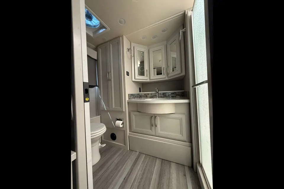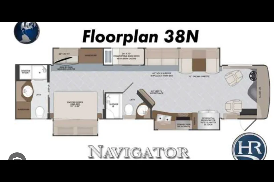 This luxury model Class A boasts of room and comfort! With King Encore® Memory Foam Mattress, Bunk Beds, and optional Hide-a-Loft™ power drop-down bed, there is sleeping capability for up to 8 people! The beautiful interior is calming and inviting. The added bonus of having 2 full bathrooms can't be beat! This is allowed out of state, so you can have a dream vacation anywhere in the US! Give Leo's Legend a try today. We know you will not be disappointed!