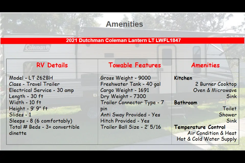 A camping vacation in Central Florida with this Coleman Lantern LT262BH can be a perfect blend of natural springs, outdoor adventure, and theme park magic. The 30' 7" length of your trailer is a great size for many area RV resorts and state parks that offer full hookups.