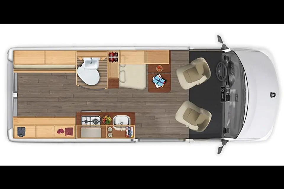 It’s super easy to drive, fits in most parking spots, and has a full kitchen, cozy bed for two, bathroom with shower, and solar power to keep the lights on wherever you wander.
