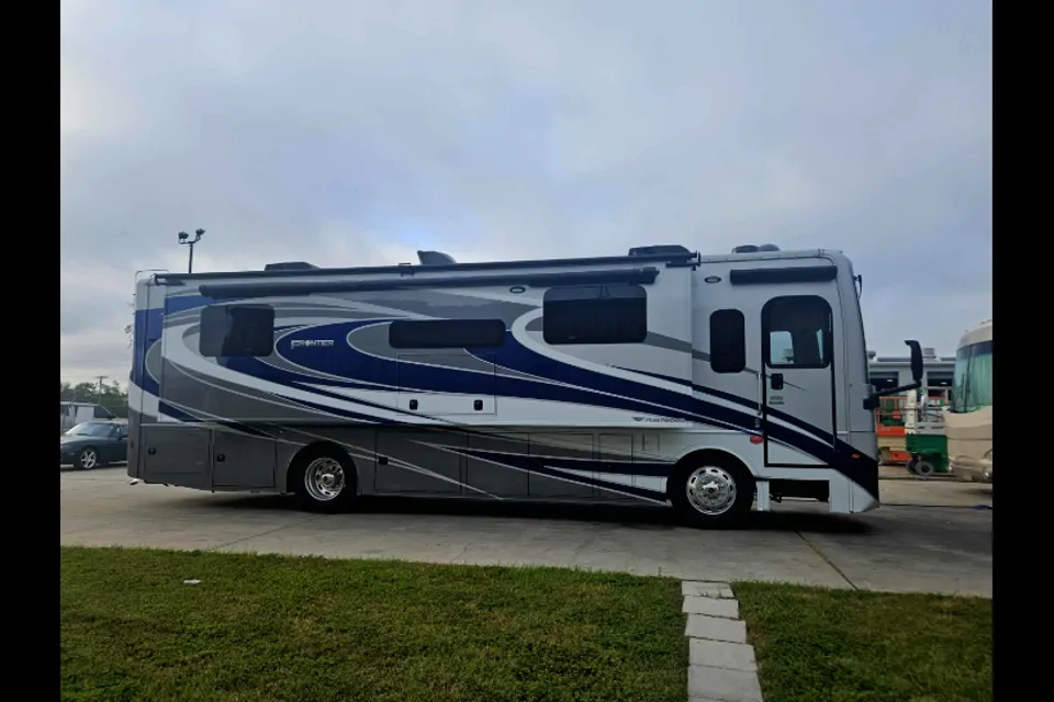 Ride in style and comfort in the 2022 Fleetwood Frontier diesel-pusher. Beautifully decorated with added touches like recliners and a gas fireplace in the living area. Induction stove, stainless steel household refrigerator and microwave make cooking a breeze. The King bed in the master offers ultimate comfort and there is a large closet for storage and hanging clothes. There is a large drop-down bed above the front seats, and the dinette also converts to a bed. . There are TVs inside and out and plenty of basement storage
