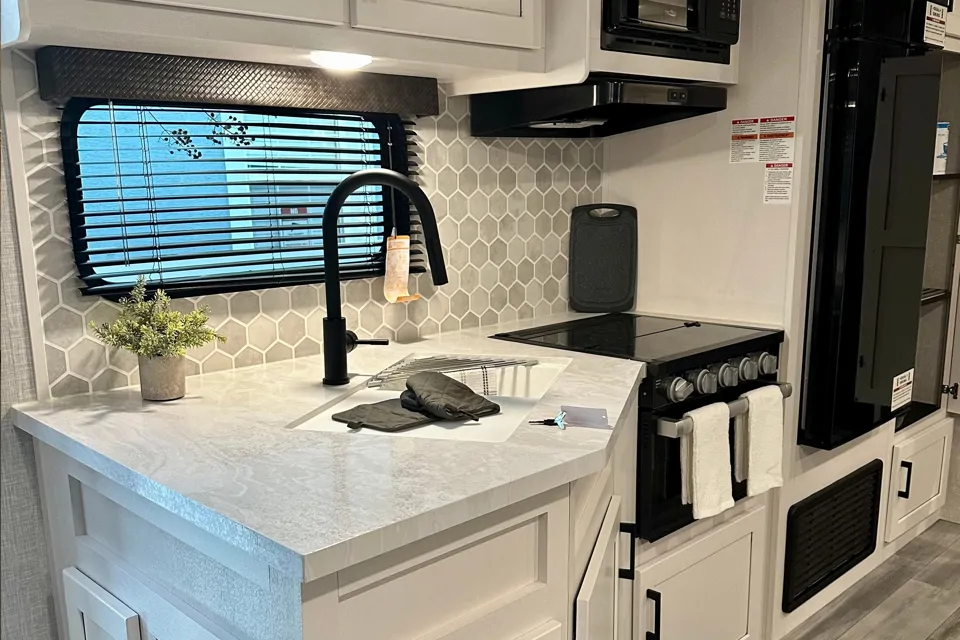 The booth dinette and jackknife sofa slide opens up the interior, creating more floor space and creates an additional sleeping area for two or more people.