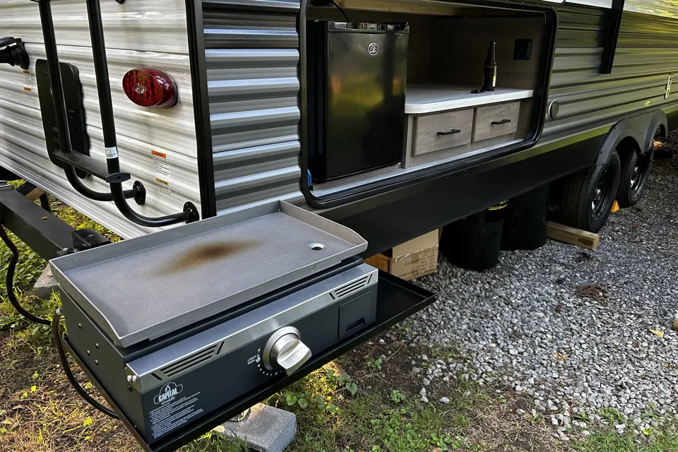 Enjoy your camping experience in a 33ft travel trailer complete with its own master bedroom and queen size bed. The opposite end has a full-size mattress bunk bed setup that can support up to 600 pounds on each bunk. There is a 50" wall mounted TV for entertainment with speakers inside and outside for maximum enjoyment! There is a nice fridge, microwave, and oven/range for cooking your meals. There is plenty of cabinet space if you need it as well. If you are off grid, there is a 52 gallon fresh water tank as well as a 39 gallon black water tank. The trailer has its own solar panel on the roof which keeps the 12 battery charged. The fridge and the main lights run off the battery when not connected to a power source. RV does have a 50amp connection, but also comes with an adapter down to a 30amp connection if needed.