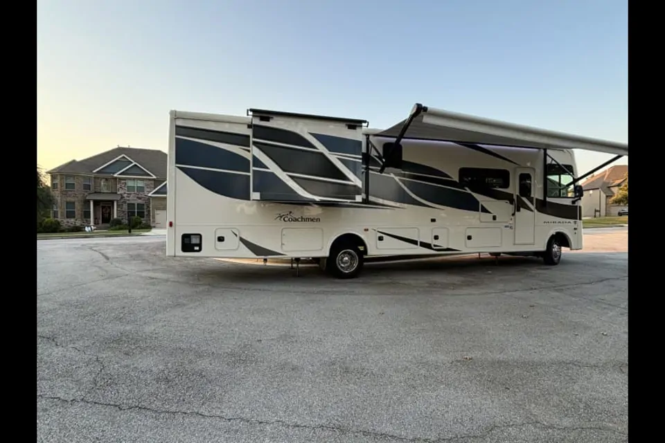Hit the road in style with this spacious Class A motorhome, perfect for families or friends. The 35ES features a king-size bed, convertible dinette, plush seating, and a fully equipped kitchen — offering all the comforts of home wherever you go. Enjoy panoramic windows, smart tech, heating & cooling, and plenty of storage inside and out. With sleek design, easy handling, and outdoor amenities like a large awning and entertainment hookups, this RV is built for unforgettable getaways.