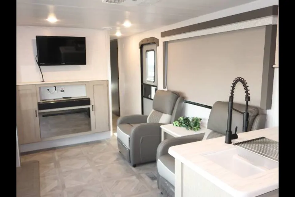 “Welcome to our travel trailer rental! It comes fully equipped with many amenities including sheets, blankets, towels, toiletries, kitchen supplies (plates, utensils, pots, and pans), and fold-out chairs. Enjoy a comfortable and convenient stay!”