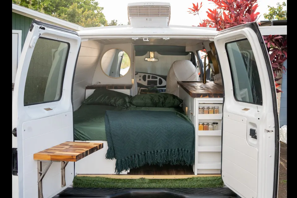This new van conversion has everything you could need for a perfect vacation to Oahu. Easy to drive and reliable! The powerful ceiling fan keeps the space nice and cool. The build is optimized to keep the space organized and clutter free. Our van has a couch that turns into a bed that is super comfortable! A sink that doubles as an outdoor shower. Loads of storage with a walk in closet, and a power strip for any gadgets you have that needs to be charged. Solar panels that allow for our fan, lights, and refrigerator to run endlessly with out worry. We have created a swivel chair in the front to add to the seating options, a pull out dinning/ work table. A portable propane stove, and even a projector that can be hung up when you want to come back from your busy day and just lay back and relax! Message me with any questions, I am happy to help!