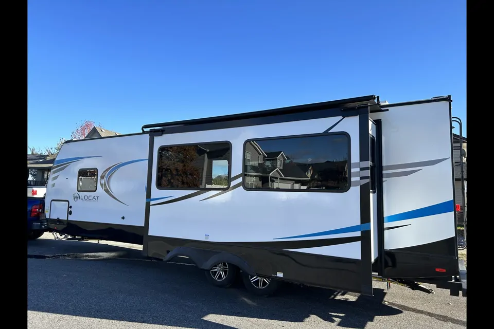 Full Couch that pulls into a bed. and 2 recliners that lay flat for sleeping of needed. Fire place, Flat screen TV. Kitchen table with 4 Chairs. Queen walk around bed. Only used 12 times in the last 4 years, Full size fridge. Outdoor shower and kitchen. Super clean. Has Solar panel. Generator for rent if needed