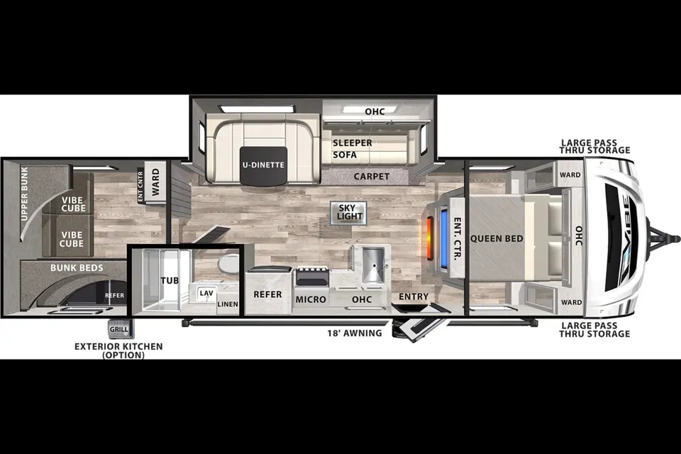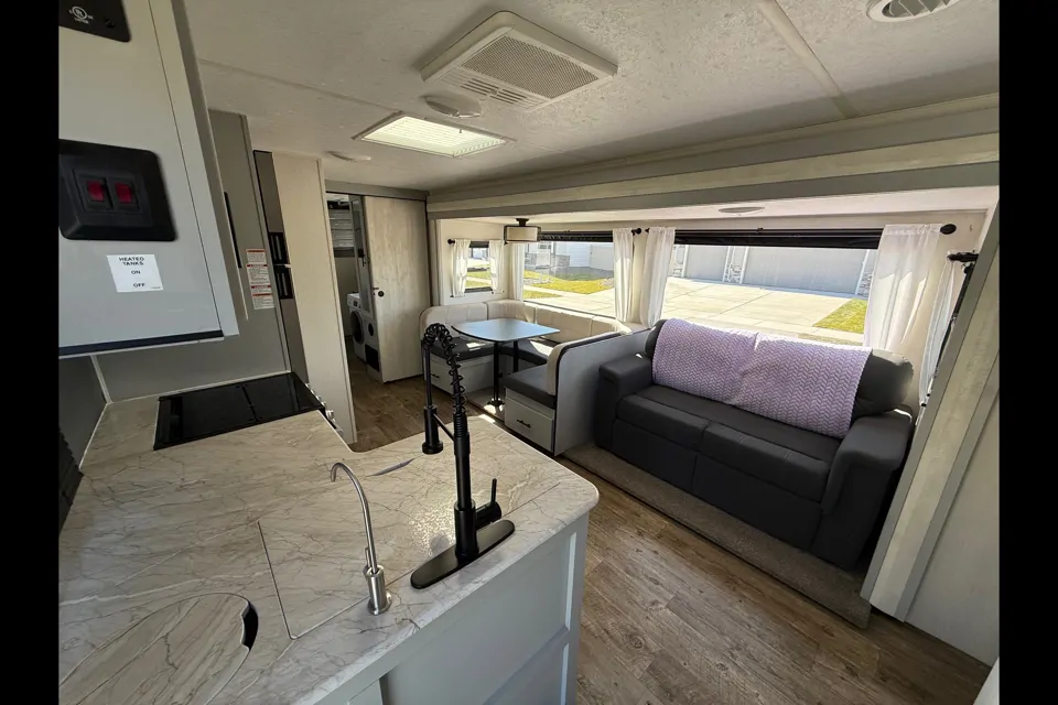 Come rent our ‘23 Vibe with a homely feel… Purchased and loved since new, this trailer was briefly full-timed in and has every little comfort of home for the perfect weekend getaway, or an extended stay at your favorite spot, with room for up to 11 (Queen master sleeps 2, pullout couch sleeps 2, kitchen table/bed converts to sleep 2, 3 bunk spaces, and 2 “Vibe Cubes” sleeping pads)