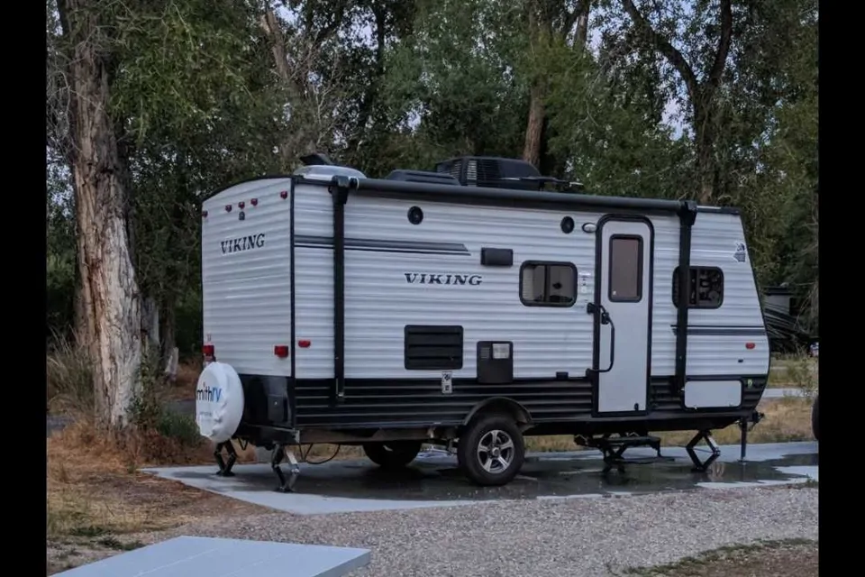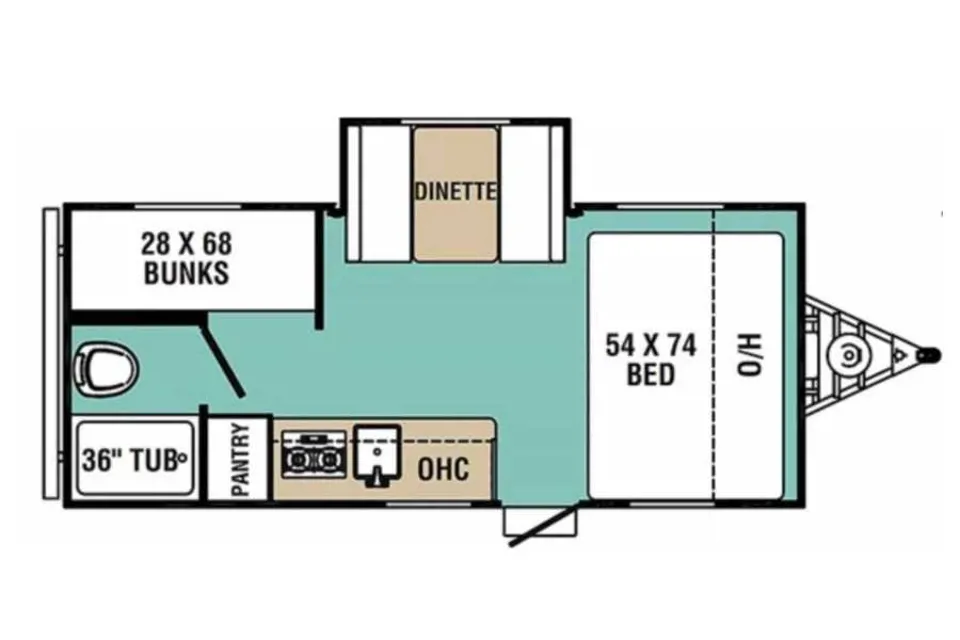 Features: RV Queen bed with upgrades mattress, RV twin bunks with upgraded mattresses. Dinette slide that can also convert into a bed. Private bathroom with tub/shower combo and a foot flush toilet. Large RV frig/ freezer, two burner cook top, sink and microwave. Storage located under and over queen bed, under both dinette benches and under bottom bunkbed.