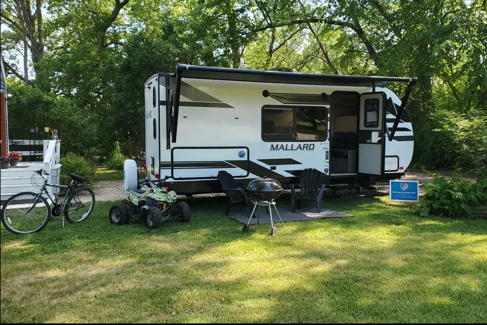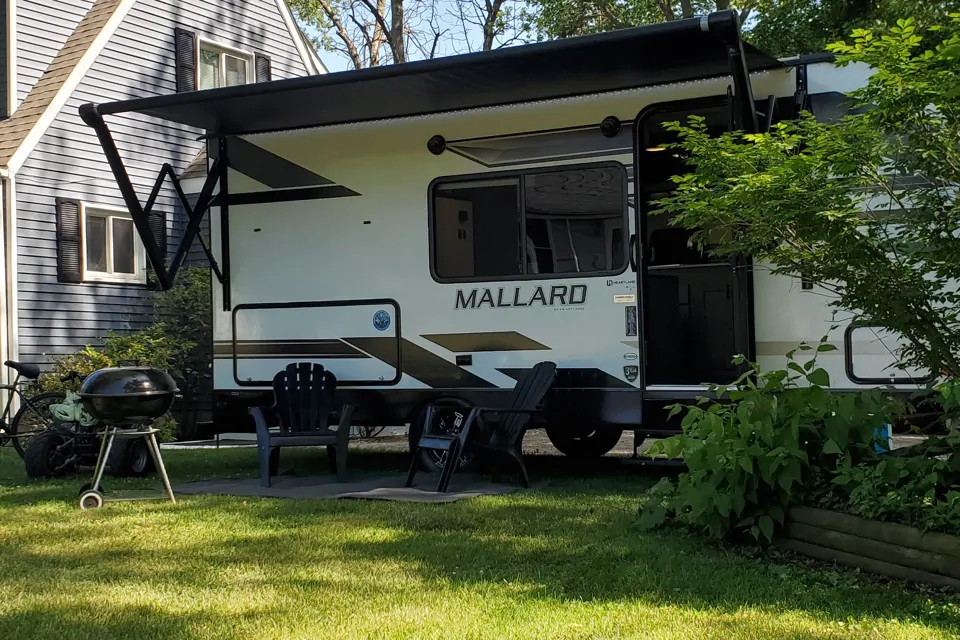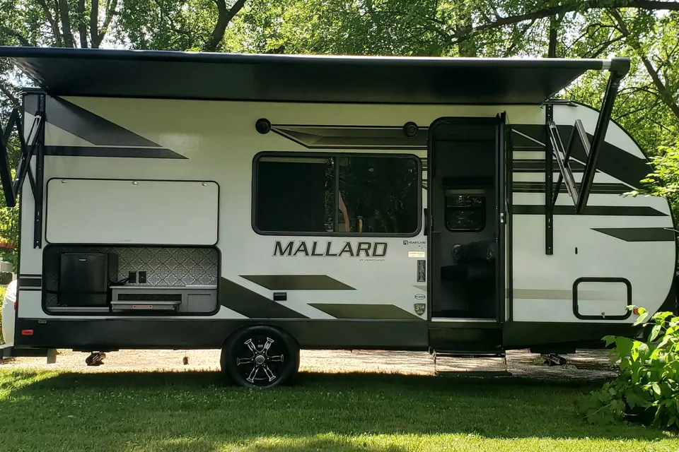 Our 2021 Mallard by Heartland M180BH RV sleeps 7, it has an indoor shower/tub, kitchen has microwave, electric stove, sink and refrigerator with doodle station, Corian countertops and silver and plasticware, cups, mugs and coffee maker included, dining set that folds into a sleeping area. One full queen sized folding bed that turns into a couch and two full sized bunk beds. AC unit, heater, plenty of storage and lighting throughout, TV, AM/FM radio with bluetooth, USB and HDMI ports, hydraulic awning and hitch lock systems. Propane tanks and gas hookup in unit, outside lights, party center with small fridge, sink and countertops located on the exterior of the unit.