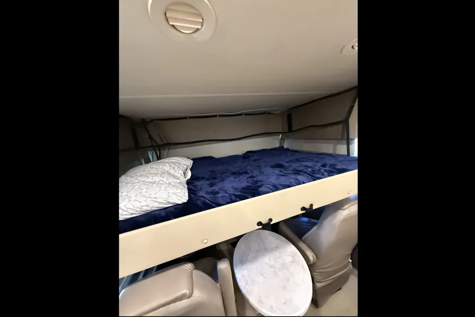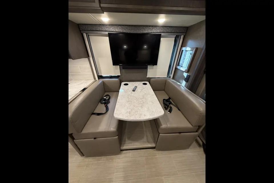 Outside, this motorhome features a sleek exterior design, a power awning with LED lights, and ample storage. It is perfect for those who want a spacious, well-thought-out RV ready for adventure.