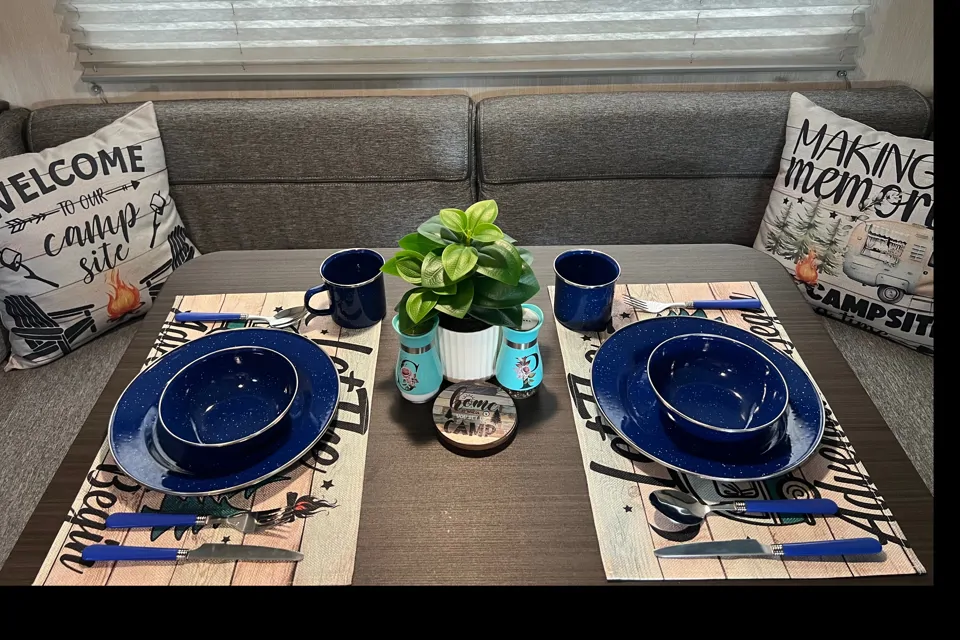 **Sleeping Arrangements:** One queen bed, one dinette conversion bed, and one single-size air mattress.
