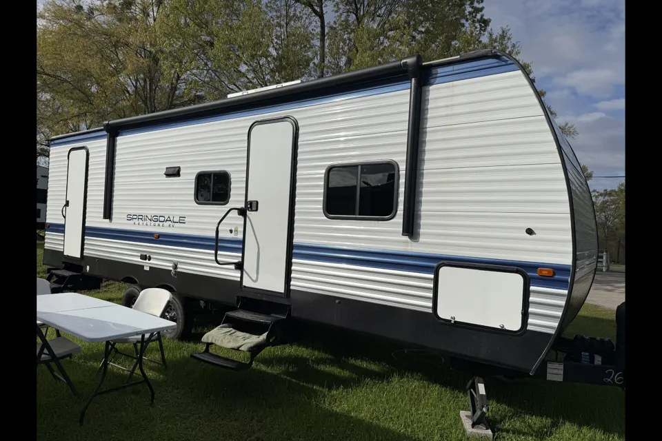 Our is Travel Trailer is Great for families with children!! Has one slide out, on demand hot water, Sleeping arrangements include private queen bedroom (linens available) with oscillating fan, Dining table and couch fold down for sleeping along with two double bunk beds with privacy curtain. USB ports for charging by dining table. Incase of a power outage it does have solar. Solar panel runs refrigerator, USB ports and lights only. Kitchen is equipped with coffee maker, toaster, electric deep fryer, paper plates, colander, eating utensils, cooking utensils, dish drainer, tupperware, ice trays, brita water pitcher and a few pots and pans. We also have a folding table and chairs for outside located in the pass through storage. There is a broom and mop for use. Trash bags, dish liquid, floor cleaner and black tank pods available for use. Microwave is also an Air-frier. Outside hook up for propane burner or BBQ pit. Key pad/Remote entry on front door & second entrance by bathroom. We have a tv with a Firestick it does require internet or hotspot to use (not included), also has antenna but depends on where you are on what channels you can get. TV sits on a ledge while being used and needs to picked up during travel. We store it on the floor at the foot of the queen bed. Must bring own pillows, blankets, towels and wash cloths. We offer a delivery and set up fee. All in all it is a nice comfy RV to spend time in while relaxing from a busy day camping! We offer a complete set up and delivery for a fee. All you have to do is show up with your stuff!