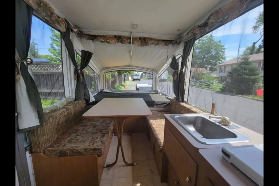 Perfect entry level model for couples and small families (we even encourage bringing your fur family). All your basic necessities come with this camper two full beds (bench seats make a third if needed), stove, sink, heater and oscillating fans for cooling. The pop-up works great at any camping spot that offers hook-ups (water and power) but can also meet the need for those looking to get away completely as I offer a small portable generator free of charge. This model does not come with sewage or running water but is outfitted with a small pump for the sink.