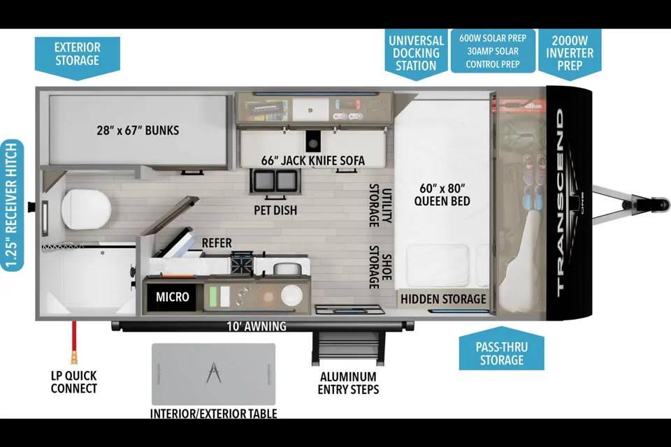 Inside, discover surprising comfort with a spacious 6'6" interior height. Recharge on the comfy queen bed, or utilize the double bunks and fold-out sofa, comfortably sleeping up to 5 adventurers. Built for all seasons, you'll stay cozy whether enjoying fall foliage or summer beaches, thanks to robust insulation, AC, and furnace.