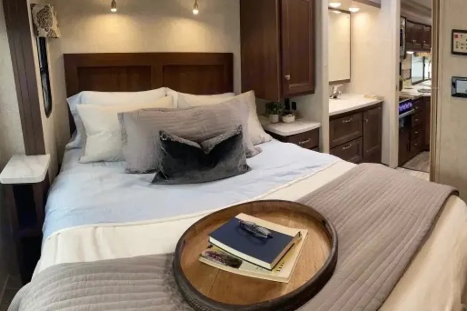 Enjoy freshly laundered, crisp bed linens with super comfortable blankets and comforters. There are two interior lighted cedar lined closets for hanging clothes and tons of additional storage cabinet storage. Bedside is a three drawer cabinet to house your glasses, reading materials and TV remotes. Above the bed are 2 soft touch reading lights for cozying up with a good book.