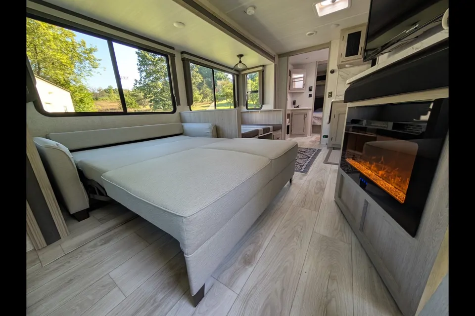 Even as the weather cools down, our new 2025 East to West Alta 2850KRL prioritizes a comfortable and spacious indoor camping experience, starting with the inviting rear living area featuring plush theater seating, convertible sofa, and a large slide-out for expanded living space that feels more like a house than a camper. It includes central heating and air conditioning from end to end. You'll find modern touches like daylight LED lights and black roller shades, creating a stylish and functional feel. The private front master bedroom, complete with a king-size bed, ensures restful nights. The walk-through bath includes a shower skylight, filling it with natural light. When it's time to unwind, the cozy fireplace and mood lighting adds warmth and atmosphere, making this new camper feel like a true home away from home. Plenty of rainy day indoor play space, books and games for the kids too!