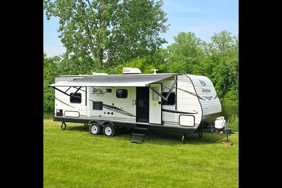 Experience the ultimate family adventure with our 2022 Jayco Jay Flight SLX 267BHS RV rental! This spacious and modern travel trailer comfortably sleeps up to 10, featuring a private queen bedroom, cozy double bunk beds, and convertible dining and lounging areas. Enjoy the convenience of a fully equipped kitchen, a full bathroom, and ample storage for all your gear. With its durable construction and premium amenities, including a power awning, LED lighting, and entertainment center, this RV ensures a comfortable and memorable getaway. Book now and create unforgettable memories with your loved ones in the great outdoors!