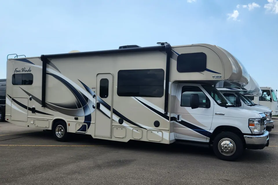 2018 Four Winds 31W. Sleeps 6 comfortably and 8 if a couple people double up. Has all the comforts of home. Stove, microwave, residential size fridge and freezer, double sink, indoor and outdoor shower, heat & A/C etc. Onboard generator for outpost camping. Comes furnished with pretty much everything you'd need such as cookware and dishes, cutlery, cleaning supplies, pillows, linens etc. Also comes with a table top Blackstone griddle, and two 1 pound propane tanks.