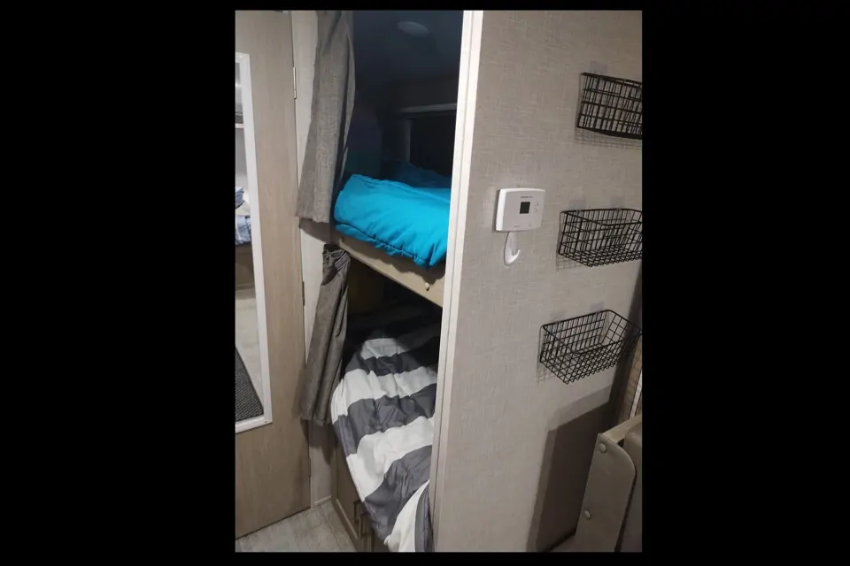 The layout is perfect for families or groups, with a full bed for a restful night’s sleep, two twin bunks for the kids or extra guests, and a dinette that easily transforms into another full bed—giving everyone plenty of space to stretch out and relax. Tilly sleeps 5-6 people.