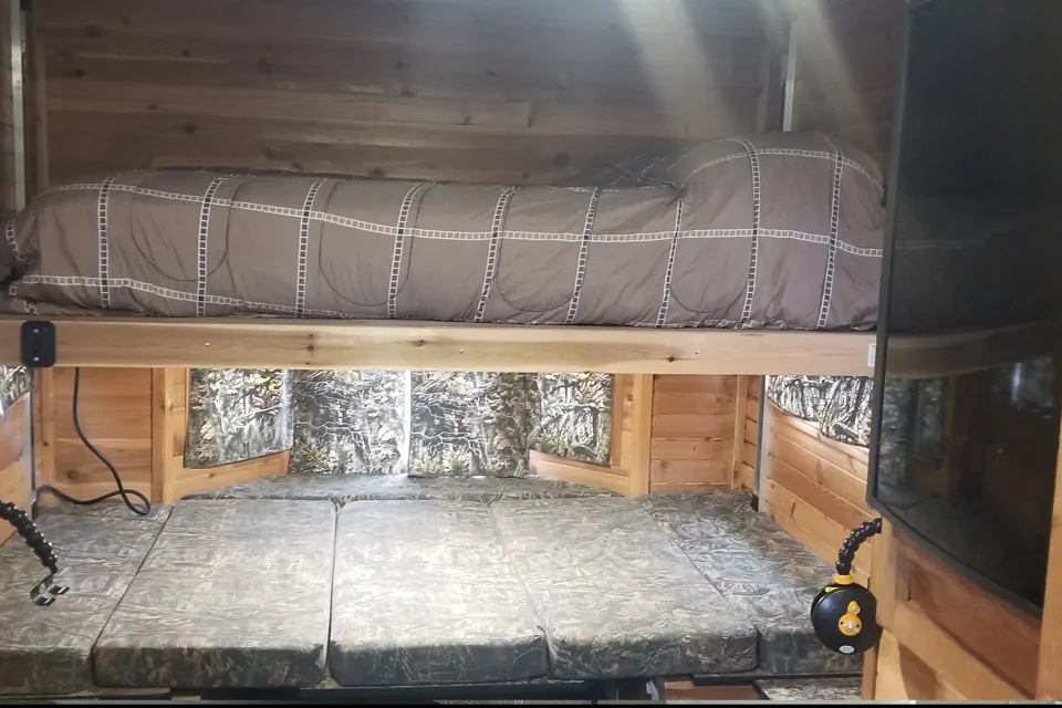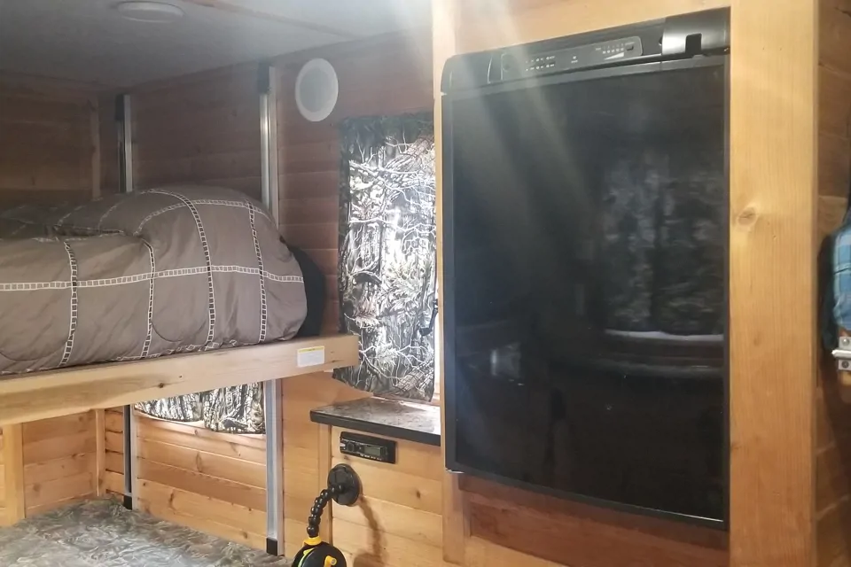 Ice Castle RV edition available for rent summer or winter. There is a full sized lift bed in back. Trailer lowers to the ground so will have one low step to enter. This camper has everything you need for camping including cookware utensils and plates. Winter rentals include rattle reels and also have options to add on other Ice fishing equipment.