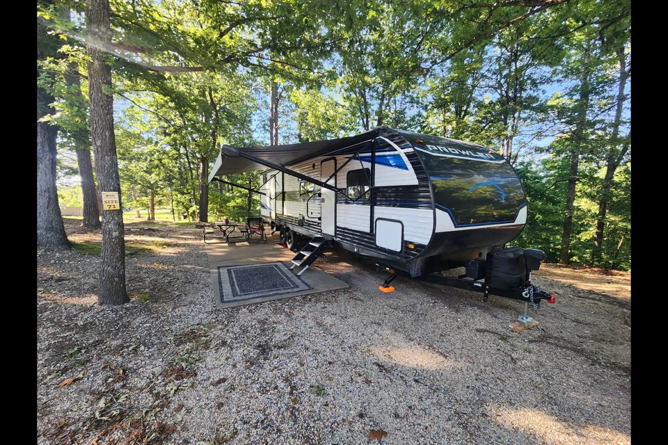 32 foot family camper with everything you need to enjoy your family trip. Room for 4 adults on a front queen bed and a double bed in the bunk room. Three single bunks and a dinette that converts to a bed.
