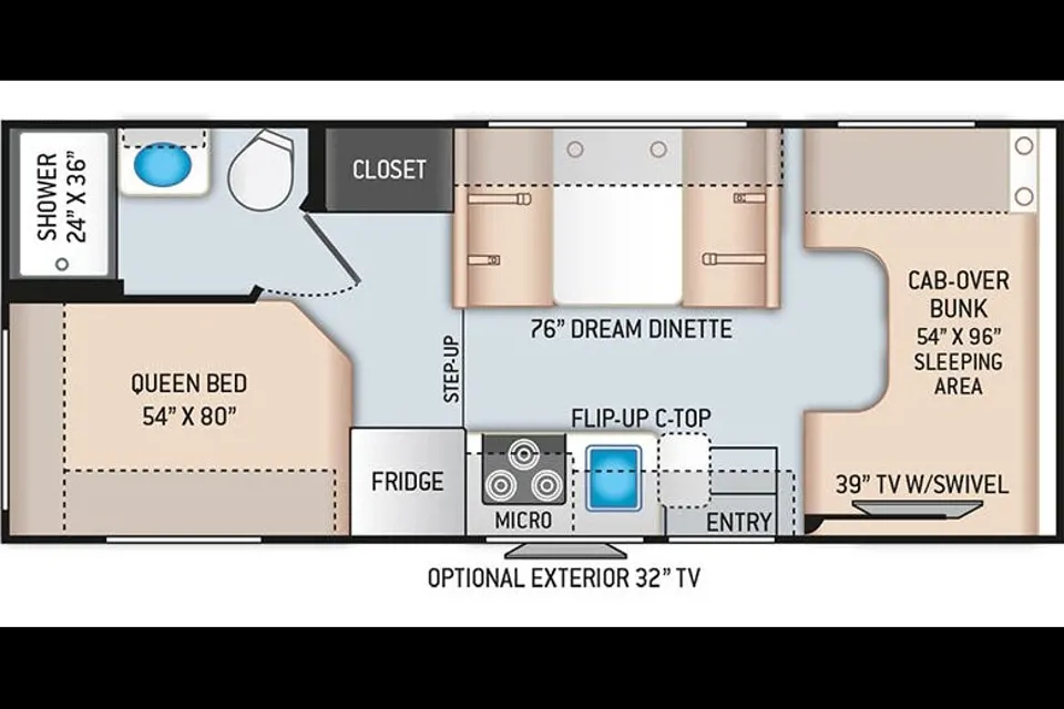 ▪ Cab-over TV with Blu-ray DVD player and DVDs included (swivels toward the dinette).