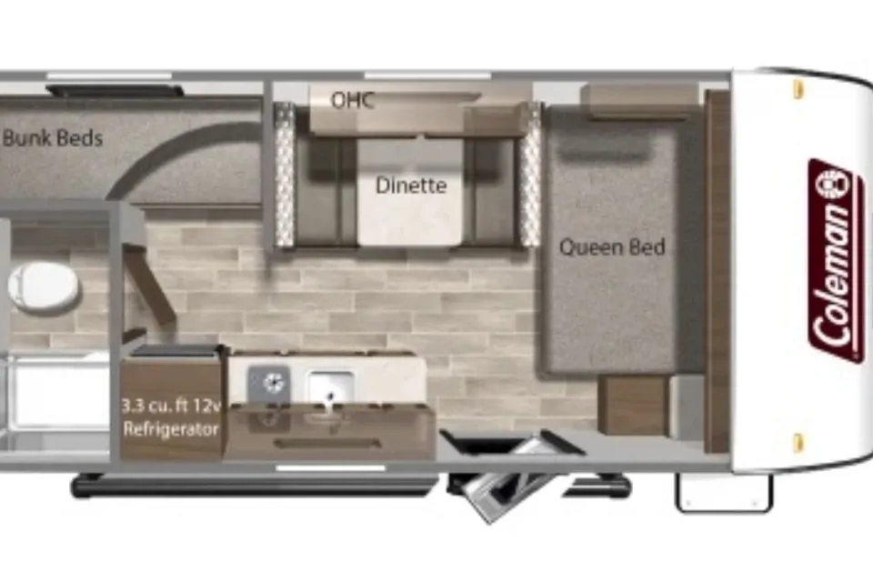 New to the campground life is the most affordable bunkhouse travel trailer currently on the market, the lightweight single axle Coleman Lantern LT 17B. With a camper queen bed, a pair of twin bunks, and a convertible dinette you’ll have room to sleep 6. As a bonus, the 17B comes with a nifty electric fireplace