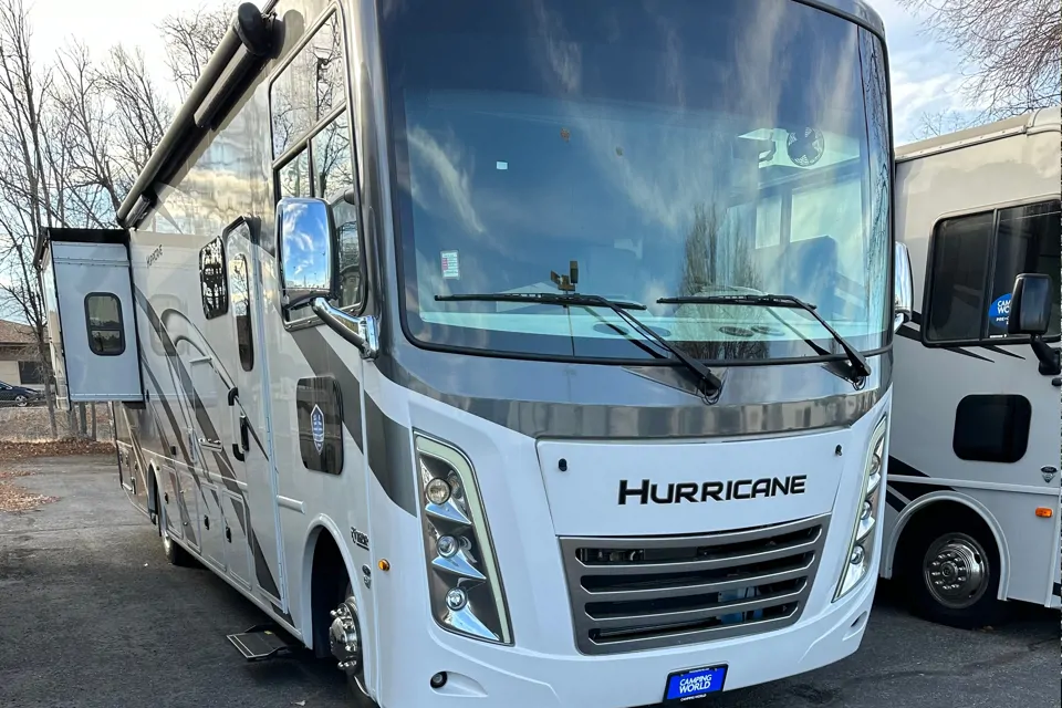This 2023 Thor Motor Coach Hurricane 35M boasts large living spaces, entertainment, and safety features like no other. With an outdoor TV, fold out chairs and table, and an awning, you can gather the crew for movie night under the stars! Tired after a long day of exploring? Relax in the spacious living area by the fireplace and turn on your favorite show on the second of three TVs. With many options for sleeping arrangements, you can choose the master suite with the king sized bed, the pull out couch, the dinette-bed conversion, or the bunk over the cab. Dinner time is easy with this fully equipped kitchen, including a 4-burner gas stove, oven, microwave, and refrigerator, along with the cooking essentials. When moving to your next destination, this RV is equipped with 7 seat belts to keep everyone safe. Equipped with 1.5 bathrooms, this RV provides convenience and privacy. The master suite has a king sized bed, TV, plenty of storage, and a full bathroom attached. This RV is the premiere option for your next outdoor adventure!