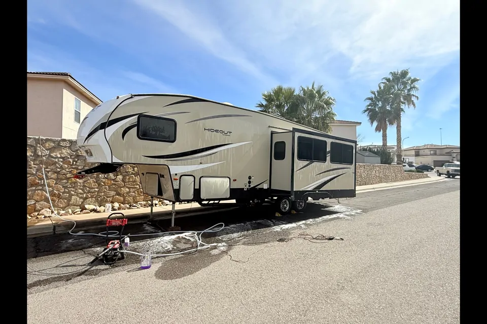 Great and cozy fifth wheel. Super clean, everything works, large tv with dvd player that includes Bluetooth for outdoor speakers. Has small outdoor grill and fridge. Dinner table, microwave. Sliding shower doors. Camping chairs and generator available if needed.