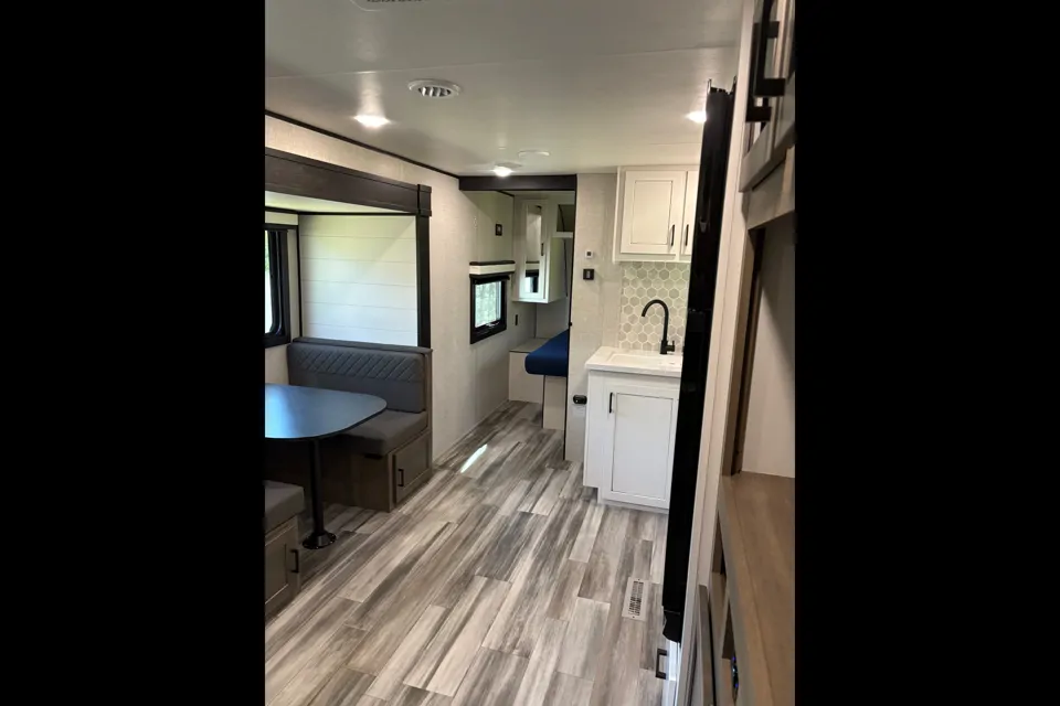 The bright and open living space features a large slide-out that creates a roomy, inviting atmosphere. Relax on the two comfortable recliners or gather around the convertible dinette, which provides additional sleeping space if needed. Oversized windows bring in natural light, while the entertainment area makes it easy to unwind after a day of exploring.
