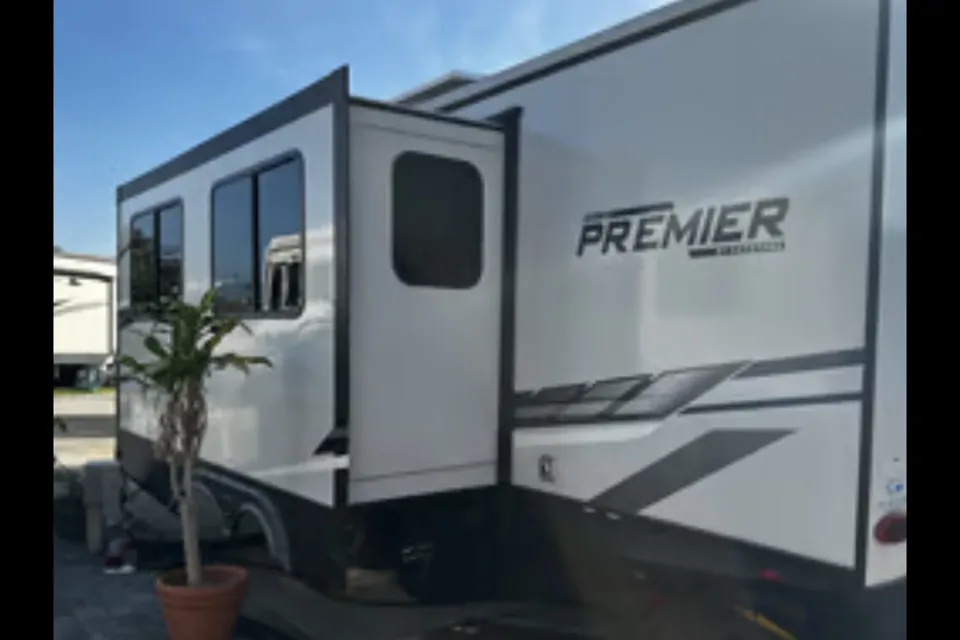 2023 Keystone Premier 32 ft Travel Trailer. Sleeps 2. Queen size bed with brand new 15” high orthopedic mattress. Full size refrigerator & freezer with additional small refrigerator in outside kitchen with gas grill built in. Island in kitchen for easy meal prep. Dining table seats 4. Inside shower roomy enough for daily use. Outdoor shower for cleaning off after playing outdoors. Ample storage areas throughout unit. We use this for 6-months in Florida in the Winter so it’s roomy enough to live in long-term.