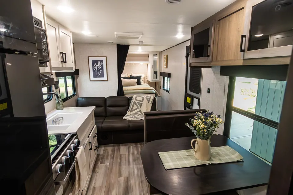 Inside our woodlands inspired RV, you'll find an upgraded plush memory foam mattress - so you can enjoy a restful night’s sleep after a day of adventure. Alongside the main queen bed, there are two full size bunk beds outfitted with twinkling fairy lights - perfect for kids or extra guests - and the dinette and jackknife sofa easily convert into a fourth and fifth bed, then back into a comfortable place to share meals or play games with the whole family. Whether you’re brewing coffee in the morning, cooking dinner after a hike, or winding down with a board game, our space is warm, comfortable, and adventure-ready.