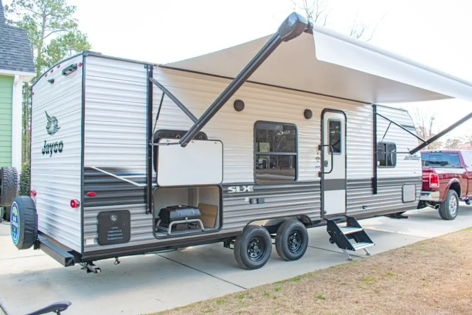 Enjoy the 16 ft electric awning with LED lights. Comes with two outdoor camping chairs, a gas grill with table and outdoor rug. Also has Bluetooth radio with indoor and outdoor speakers.