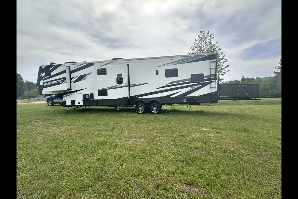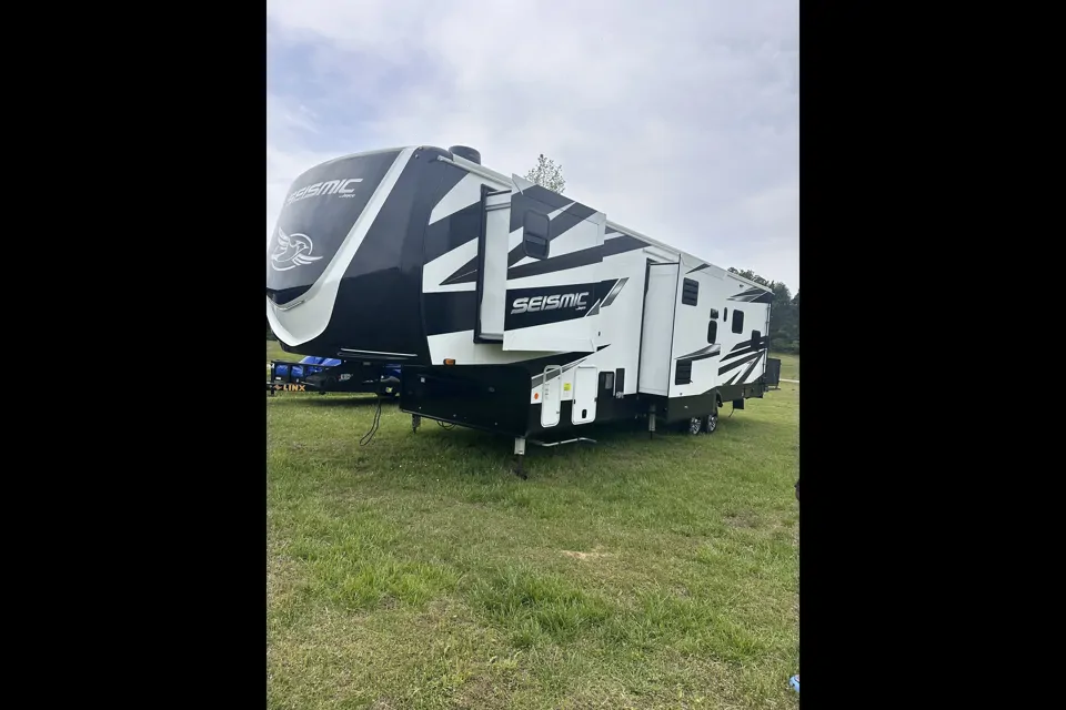 One look at the Seismic toy haulers by Jayco, and you'll never go back! Each model features a custom automotive-grade vinyl exterior graphics package, a painted fiberglass front cap with built-in LED lighting, and 102" wide-body structural steel I-beam construction. You'll find the pass-through storage with Slam-Latch baggage doors will make unpacking easier than ever, and the rear ramp door/patio with anti-slip, non-skid flooring will allow you to unload your toys with no trouble at all. These toy haulers feature a three seasons garage wall/doors, a 30 gallon fuel tank with a timer, and exterior marine-grade speakers to keep the party going. The Climate Shield zero degree tested weather protection includes a 35,000 BTU furnace, PEX plumbing, and a fully enclosed and heated underbelly so you can enjoy your adventures year around. And we haven't even touched on the interior luxuries you'll find, like solid hardwood cabinet doors, residential vinyl flooring made in the USA, night shades, and more!