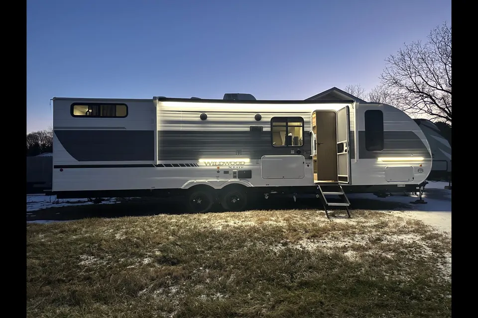 2026 Forest River 28VBXL Wildwood X-Lite is a versatile, family-friendly travel trailer featuring a private rear bunkhouse a front bedroom with a custom king Versa-Tilt bed, a U-shaped dinette, a Versa-Lounge, and a full bathroom, sleeping up to 9-10 people comfortably, plus modern amenities like LED lighting, an entertainment center with fireplace, panoramic windows, an exterior camp kitchen, and features for half-ton towing. great for family’s and groups for racing events, camp grounds, or for adding extra room at the house for holidays.