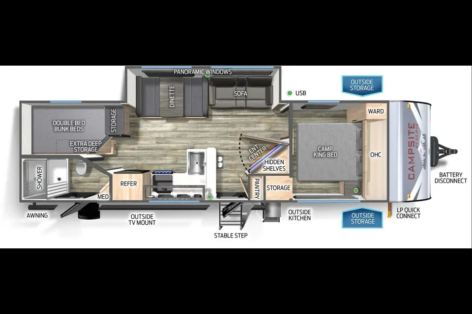 The camper is outfitted with both air conditioning and heating to keep you comfortable in any weather. You’ll also enjoy plenty of storage space and an awning for shaded outdoor lounging. For added convenience, we offer delivery and set-up to your campsite or chosen location—just show up and start relaxing. Whether you're heading out for a weekend getaway or an extended stay, this camper has everything you need to make your trip easy and enjoyable.