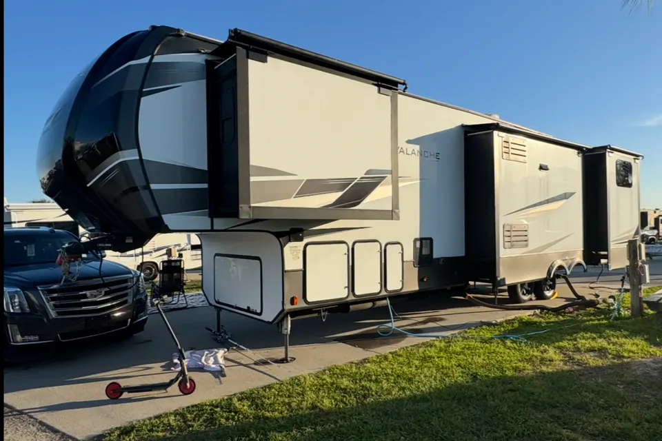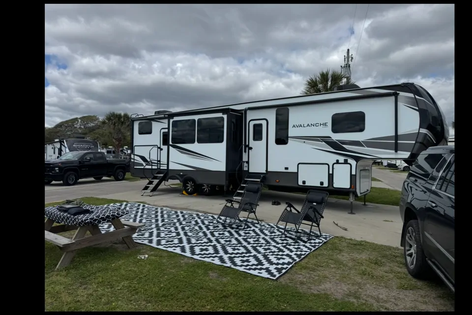 2021 Keystone Avalanche. Sleeps 6 comfortably. Full-size refrigerator. One full bath and one half bath. Main bedroom up front, bunk house in rear. Remote gas fire place. Camping chairs provided with outdoor ground mat.