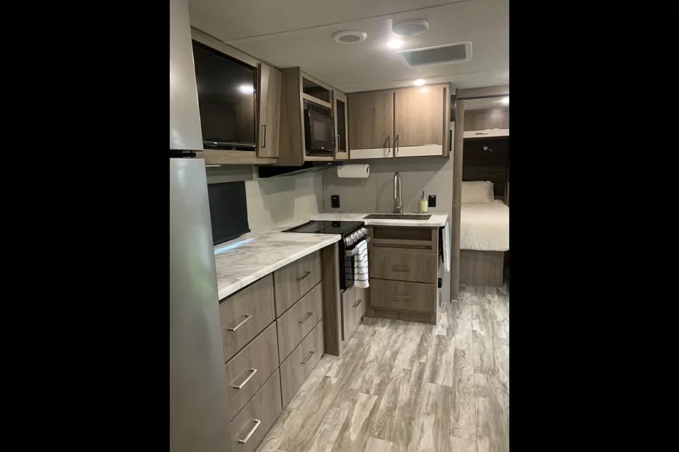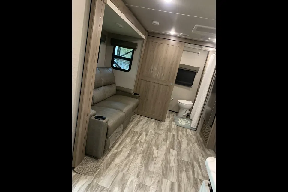 There is plenty of space in this cozy little camper. The one slide opens up the living room giving plenty of area to move around. For sleeping, there is a queen bed and a comfy recliner couch with lights and massagers!