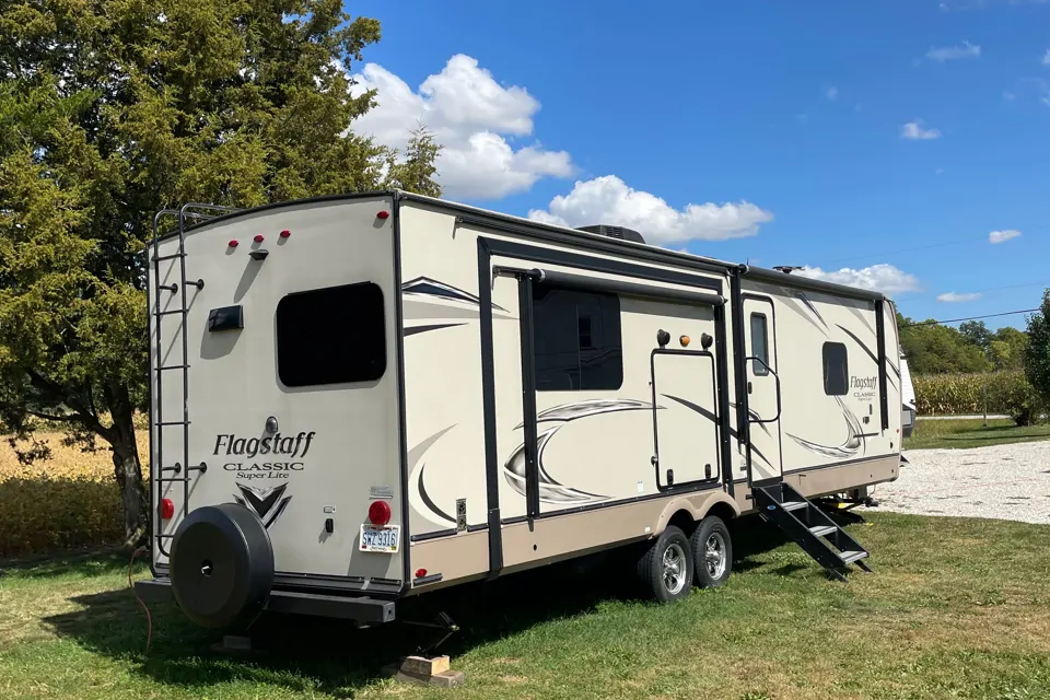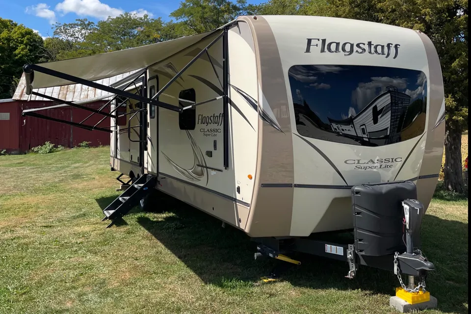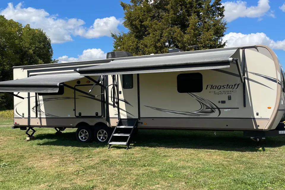 If you are looking for the perfect camper for you, you and your +1 or you and your small family then look no further! One large bedroom in the front of the camper with queen size bed and the option to accommodate additional guests with the pull out sofa bed in the living room. Very modern, spacious and comfortable. Full size fridge, oven, range top, and microwave. Lots of counter top and cupboard space with pantry for additional storage. Cozy living area with double reclining love seat and sofa seating. Outdoor kitchen features the convenience of a pull out gas grill and a 17" outdoor Blackstone grill and mini fridge. The dual extendable awnings protects you from the elements so you can relax and enjoy the outdoors in comfort. On-demand hot water heater supplies extra hot water which stands out from traditional camper hot water heaters.We deliver and do the full setup of the camper which includes drop-off, leveling and orientation of how to use all the features of the camper! This camper has the thermal package and is well insulated and winter ready. We also offer discounted rates for off-season and winter camping. Well behaved supervised pets allowed. The camper has all the amenities and comfort features to offer a glamping experience like no other! Our campers are stocked with the essentials that include: bedding and linens, bath and kitchen towels, RV safe toilet paper, 2 rolls paper towels, dish soap, hand soap, basic cleaning supplies, trash bags, cooking and eating utensils, plates and cups. You are more than welcome to bring any of your personal items for your own personal experience if you prefer. Relax and enjoy feeling right at home, wherever you roam!