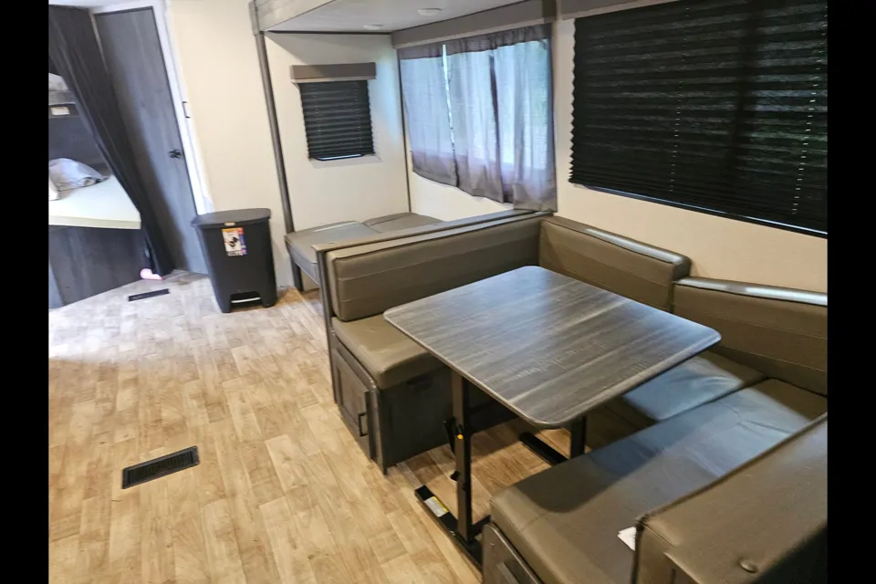 Well kept newer travel trailer with a big slide for more space. Huge pantry for food storage. Perfect for an experience with the family, features a bath tub for the littles. 2 tv's, 2 AC units and 2 full size double bunks as well as a queen in the master. So everyone is comfortable.
