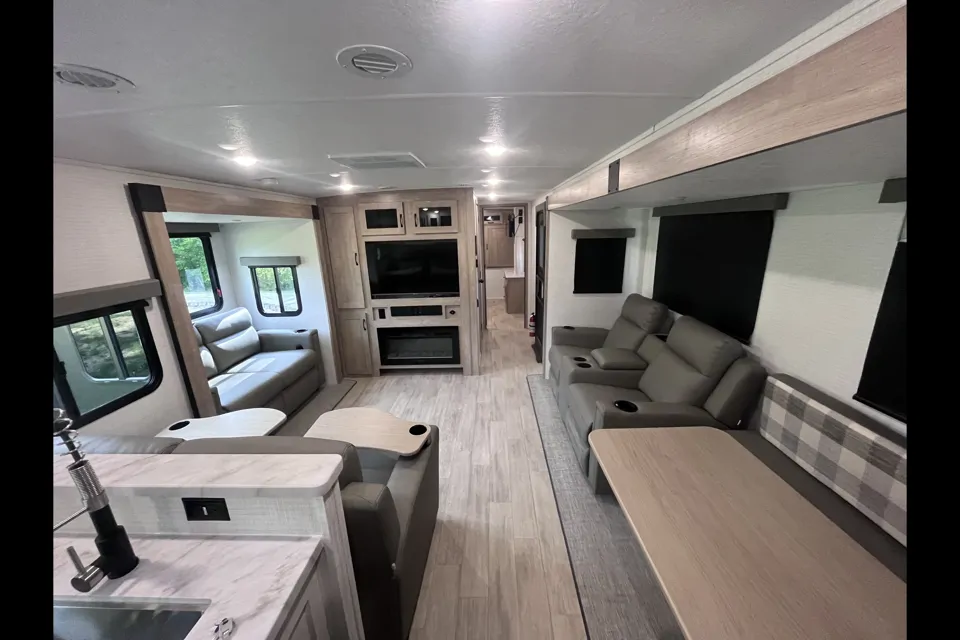 Introducing our amazing new travel trailer! It has room to sleep3- 4 people, so it's perfect for families or friends. It comes with a fold out couch and 4 comfortable reclining seats. Each of the seating areas are equipped with charging ports. The kitchenette area also provides an eat in kitchen table with a booth and extra chairs. And better yet, it’s stocked with everything you need for a fantastic trip!